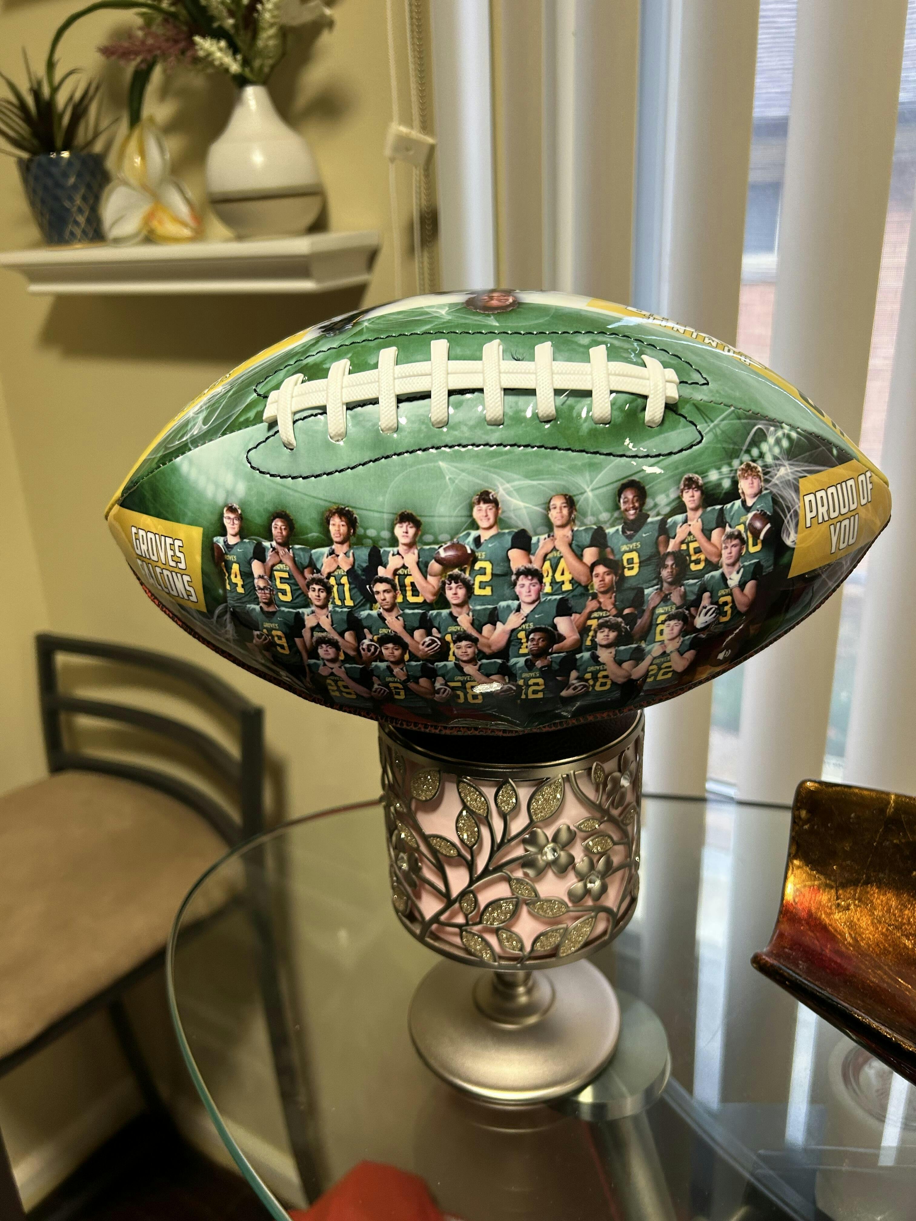 This beautifully crafted made football 🏈 was perfect my grandson loved it he can wait to display it in his new room I just want to say Thank you for making my grandson happy